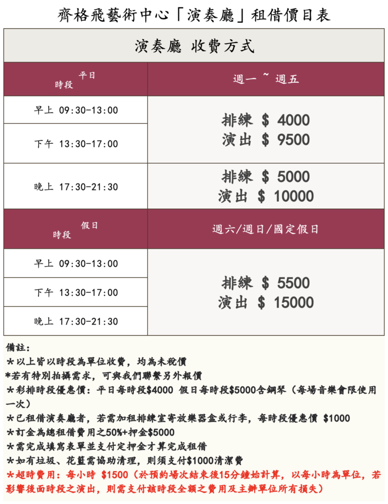 *以上皆以時段為單位收費,均為未稅價*若有特別拍攝需求,可與我們聯繫另外報價*彩排時段優惠價:平日每時段$4000 假日每時段$5000含鋼琴(每場音樂會限使用一次)*訂金為總租借費用之50%+押金$5000*需完成填寫表單並支付定押金才算完成租借*如有垃圾、花籃需協助清理,則須支付$1000清潔費*超時費用:每小時 $1500(於預約場次結束後15分鐘始計算,以每小時為單位,若影響後面時段之演出,則需支付該時段全額之費用及主辦單位所有損失)*長期排練租用價格另議
